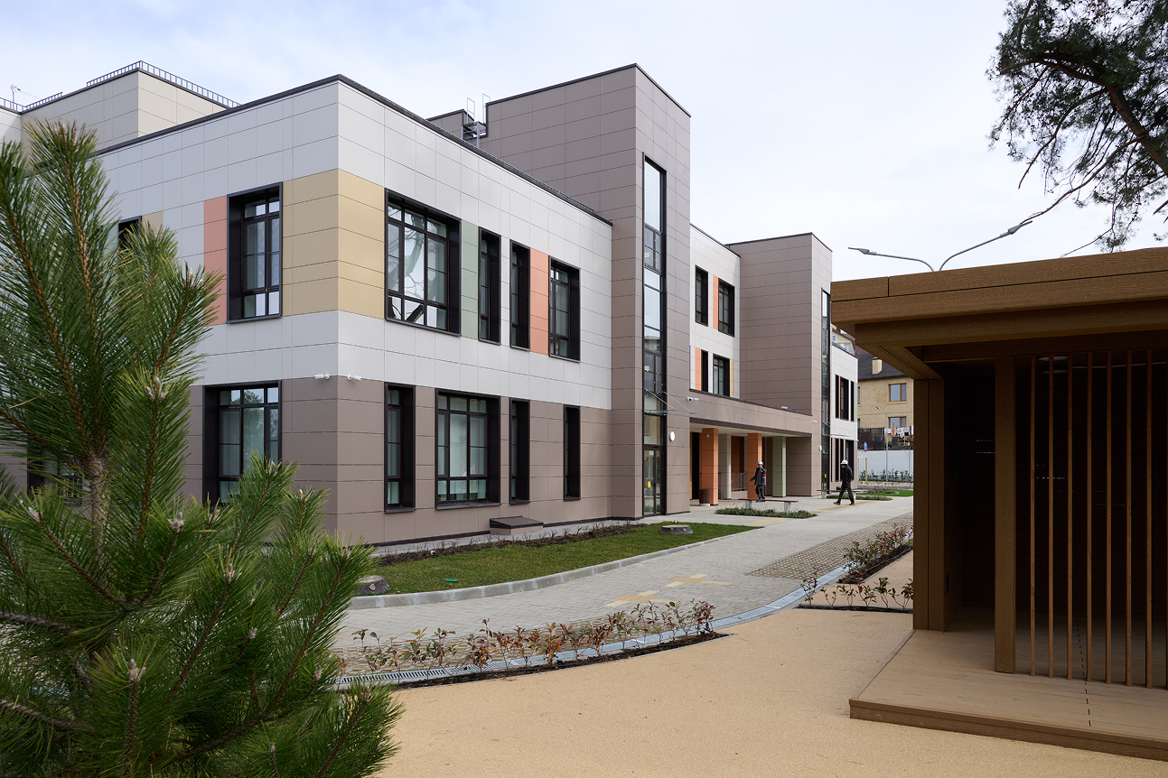 На прилегающей территории площадью 0,6 га организовано озеленение и обустроены игровые площадки, соответствующие требованиям безопасности и потребностям разных возрастных групп. Для обеспечения доступной среды проектом предусмотрены безбарьерные входные группы.